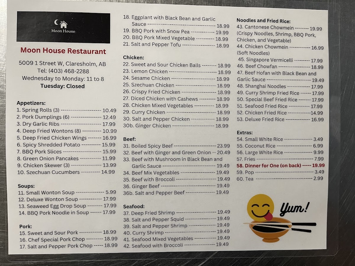 Moon House Restaurant offers a straightforward and inviting menu featuring classic Chinese dishes that feel both familiar and satisfying. Ideal for casual meals, the menu serves comforting options that make it easy to enjoy a relaxed lunch or dinner, whether dining solo or sharing with friends and family.